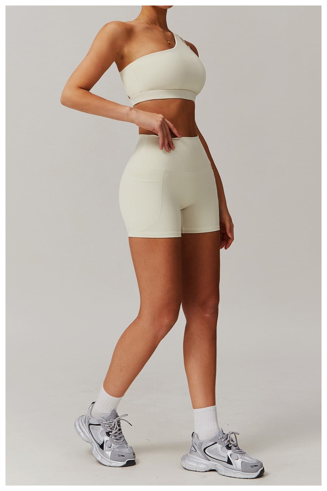 Cream White sculpting shorts with stretch support, soft compression, and on-the-go pockets.