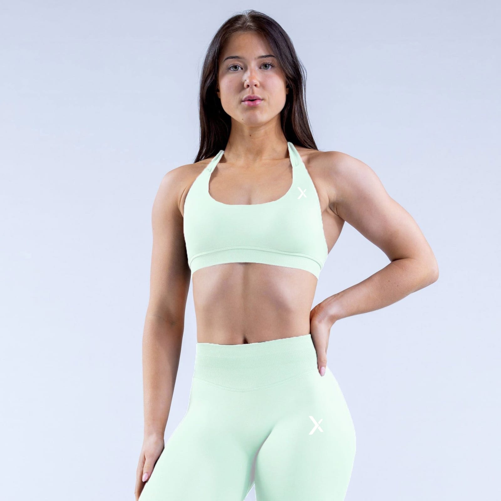 The SculptFit Halter Sports Bra in Palm Green offers seamless support, high-stretch comfort, and a stylish open-back design for maximum mobility.