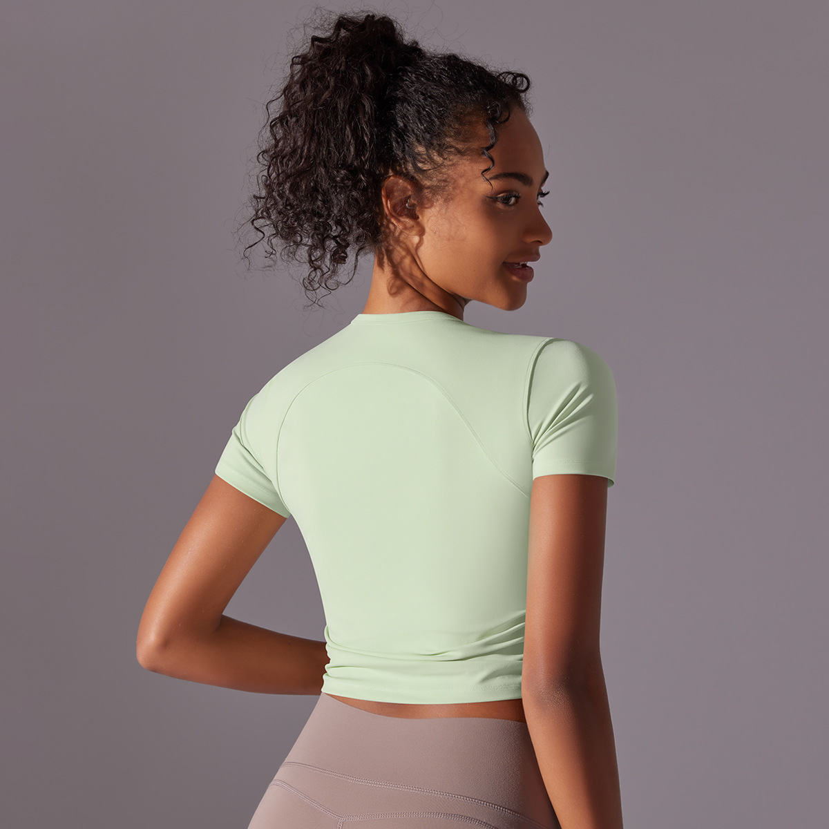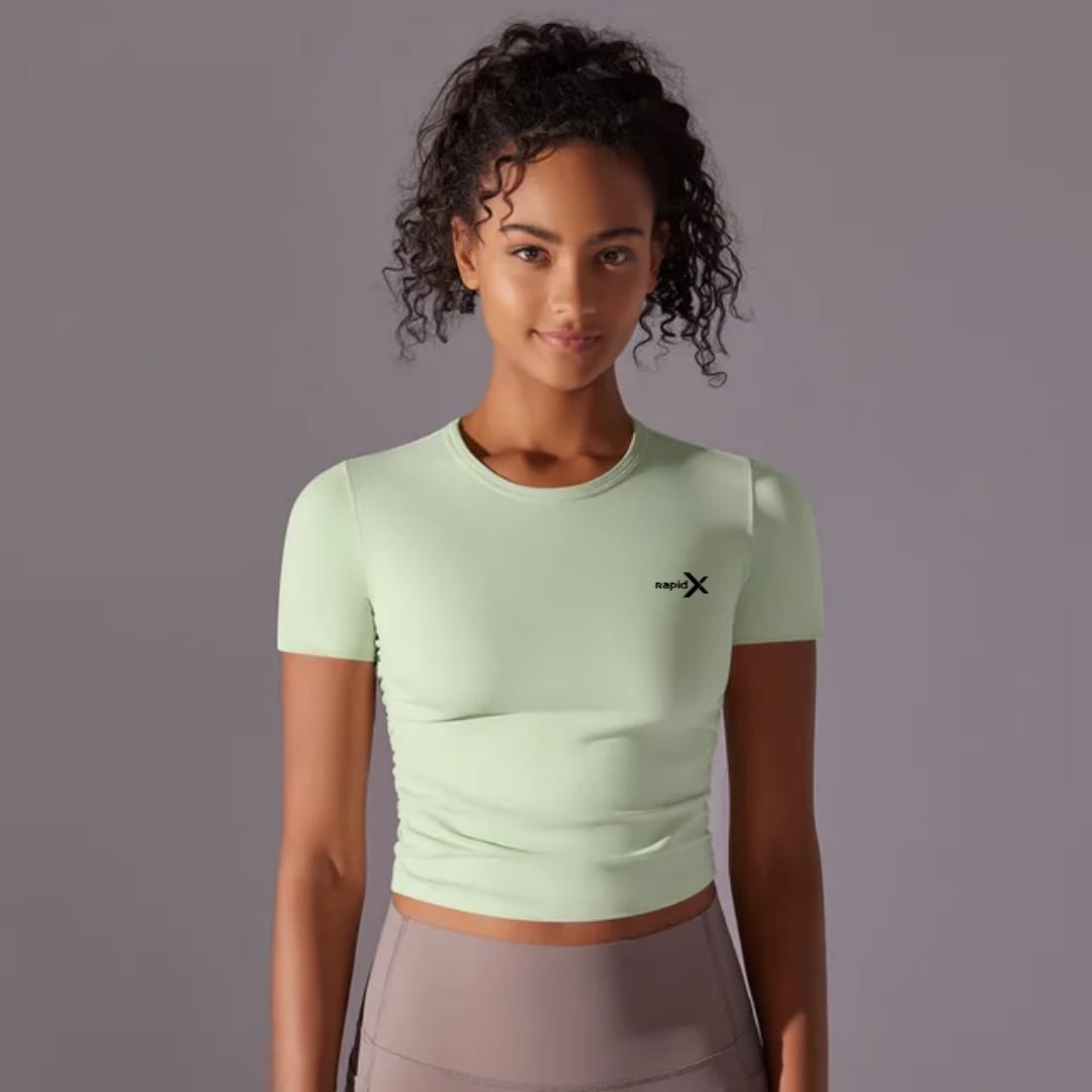 Brighten up your summer wardrobe with the Breeze Cropped Top in Light Green. Perfectly designed with slimming side ruching, this short-sleeve top blends sporty vibes with high-performance functionality. The lightweight, sweat-wicking Spandex/Nylon fabric keeps you cool and comfortable, while its four-way stretch ensures full mobility during workouts or casual outings.